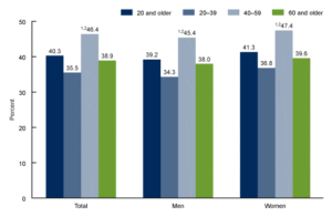 As the graph demonstrates, the United States leads the world in obesity trends. The problem affects all age groups, although seniors tend to be less obese than Americans who are between the ages of 40 and 59, as this data from 2023 shows: